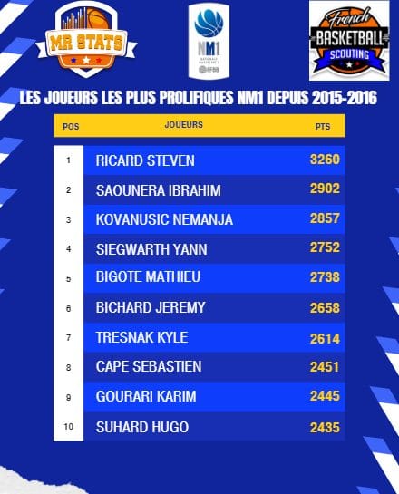 Mr Stats, spécialiste comme son nom l'indique des statistiques de NM1, NM2 et NM3, possède une banque de données de neuf saisons, ce qui lui a permis de sortir le classement des top marqueurs de NM1 en cumulé.