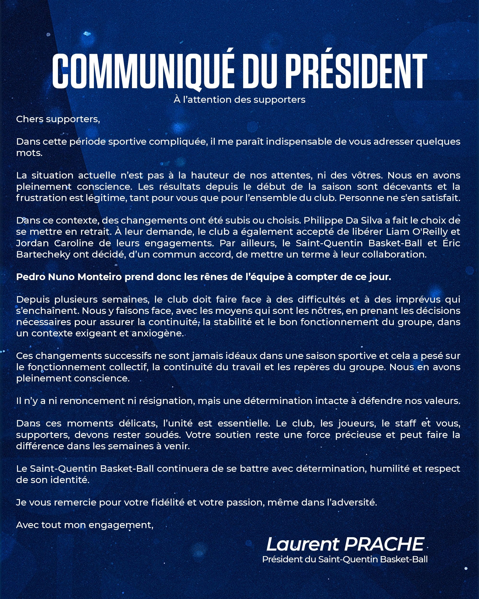 "Le SQBB et Éric Bartecheky ont décidé, d’un commun accord, de mettre fin à leur collaboration. Le Club remercie Éric pour son engagement et lui souhaite bonne chance pour la suite de sa carrière. Éric remercie le SQBB pour son accueil et encourage l’équipe pour la suite de la saison", est-il écrit laconiquement dans un communiqué.