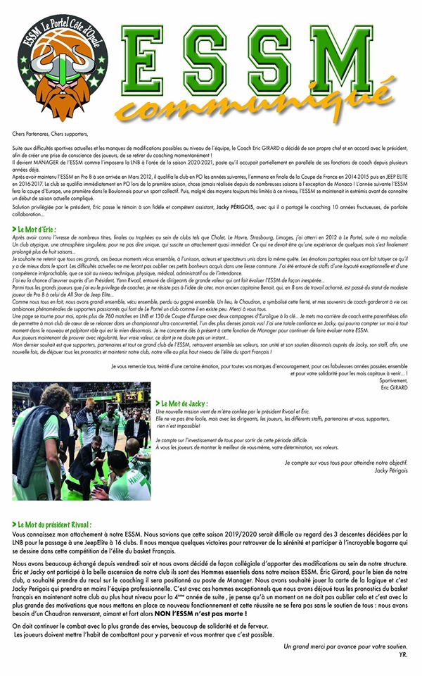Alors que l’EESM Le Portel ne compte que 3 victoires en 13 rencontres et vient d’échouer au Chaudron face au Mans, Eric Girard annonce dans un communiqué qu’il met sa carrière de coach entre parenthèses afin de se consacrer à son autre job de manager général. C’est son adjoint Jacky Périgois qui prend sa succession.