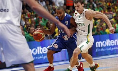 [pub_300] Le verrou français ne saute pas en début de deuxième quart-temps. Pendant près de 5 minutes à cheval sur la fin de la première période et le début de la deuxième, les Lituaniens sont incapables de marquer le moindre point. Incroyable pour l’équipe qui a pourtant la meilleure attaque du tournoi (88,2 pts en moyenne avant ce match) ! Nando De Colo fait une excellente entrée et marque 8 points consécutifs pour donner 6 points d’avance aux Bleus (20-26), puis Parker et Batum creusent un peu plus l’écart sur des contre-attaques (21-30 à 3’30 de la mi-temps). Les 11 000 fans lituaniens ont beau pousser leurs joueurs en scandant « Lietuva ! Lietuva ! Lietuva ! », rien n’y fait. La défense française oblige les joueurs du coach Kestutis Kemzura à ne mettre que 38 % de leurs tirs à la mi-temps, alors que ceux-ci ont normalement la meilleure adresse de l’Eurobasket (56,5 %). Les Bleus mènent 28-34 à la pause.