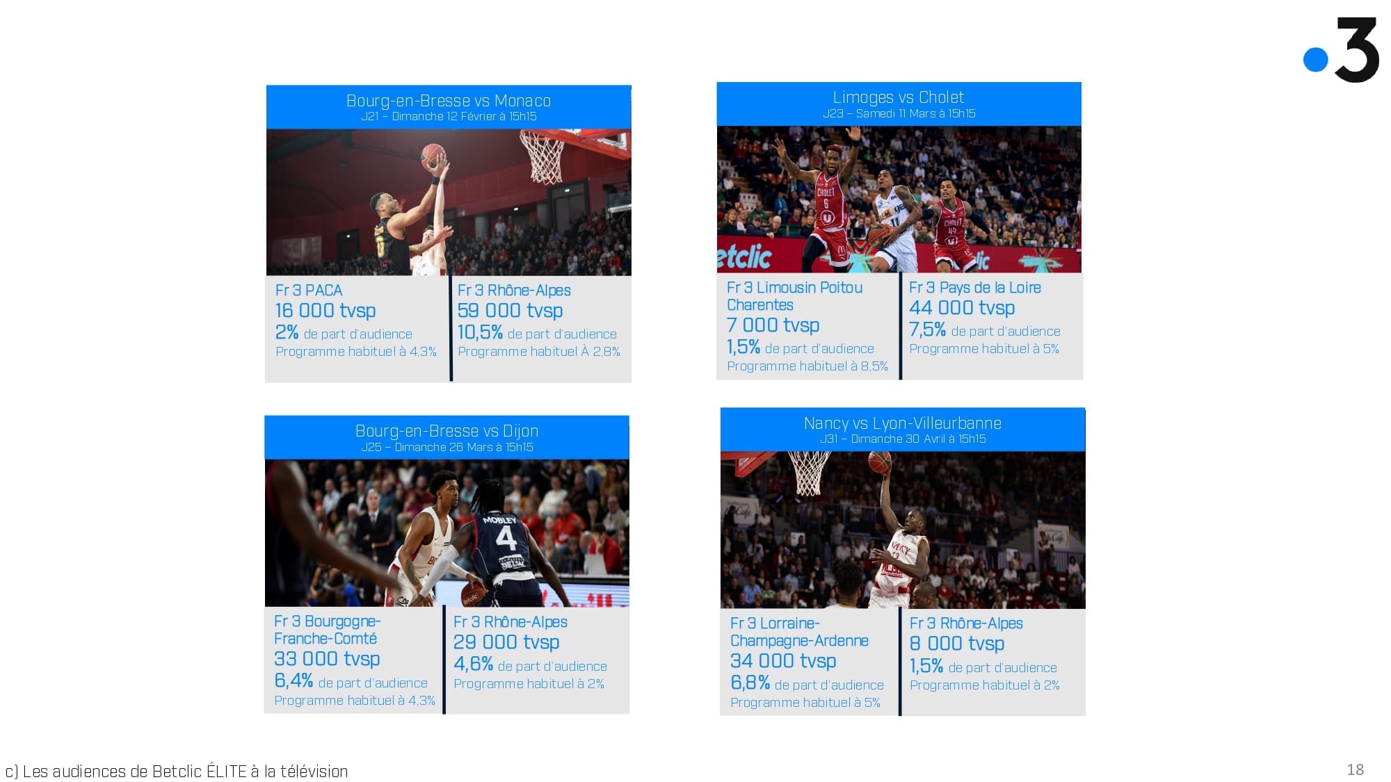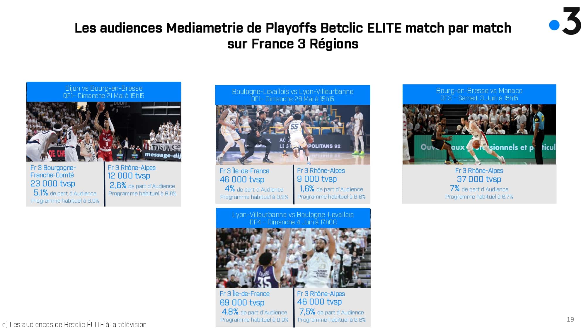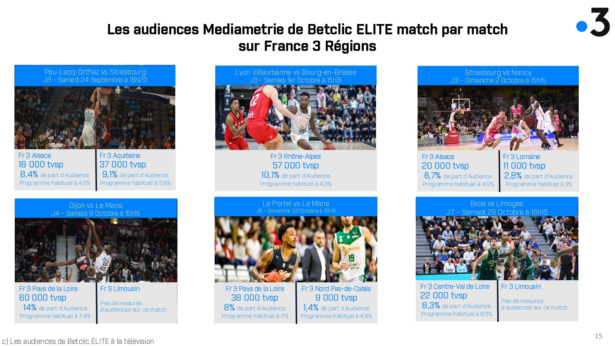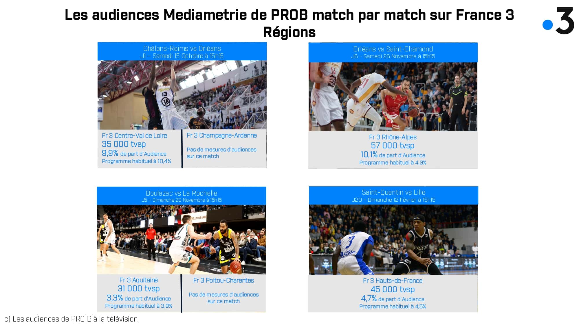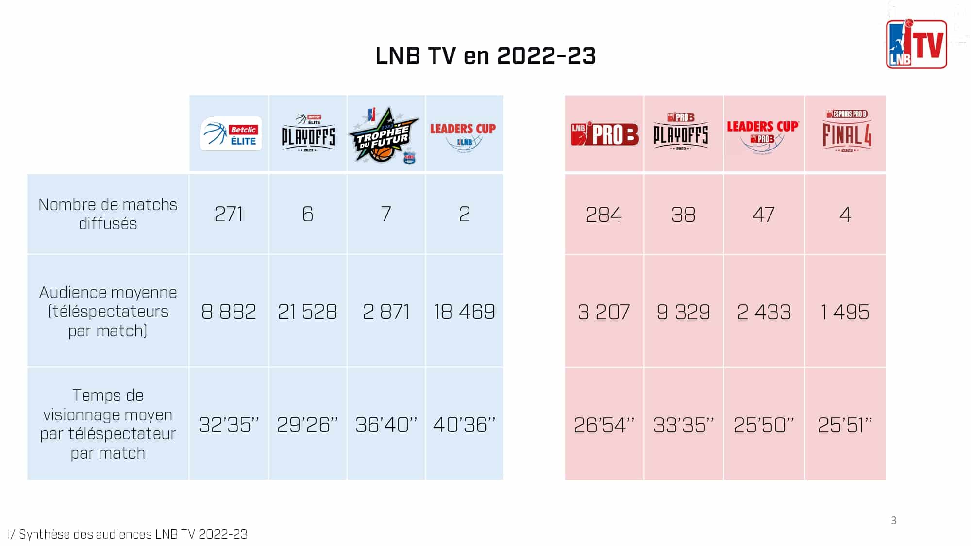 La Ligue Nationale de Basket a publié un document qui compile l'ensemble des audiences sur France 3 lors des décrochages régionaux et sur LNB TV, pour la Betclic Elite et la Pro B, ainsi que sur La Chaîne L'Equipe pour la Leaders Cup.