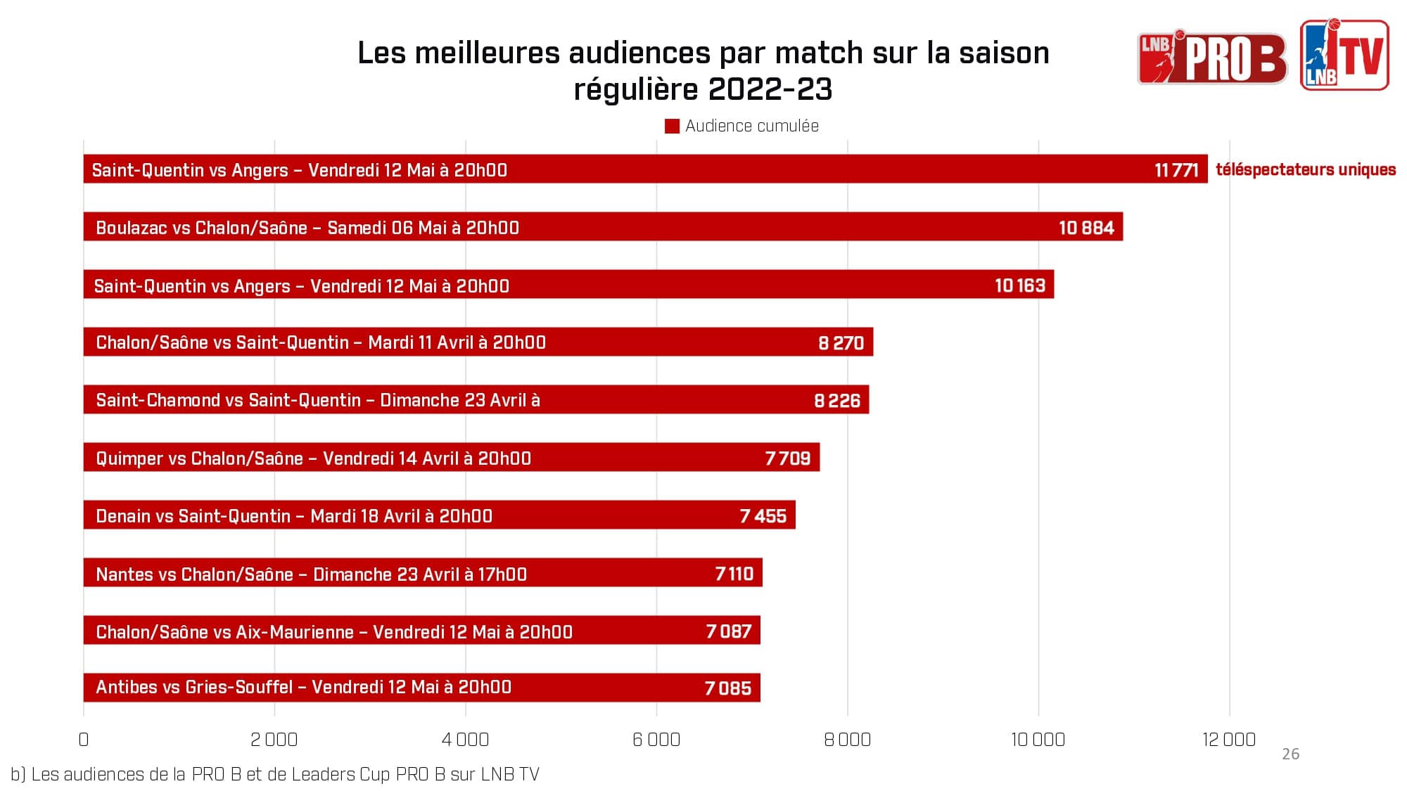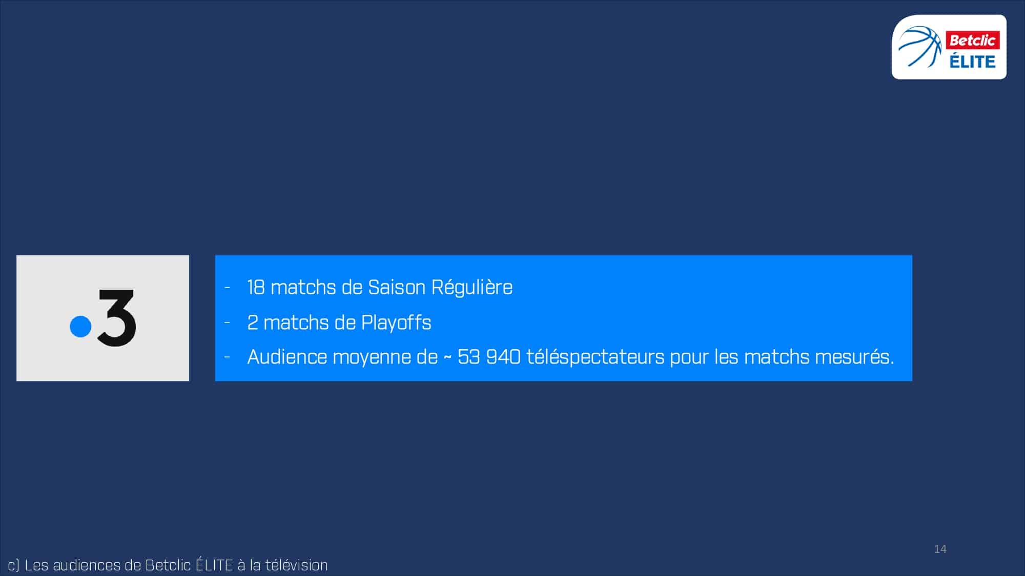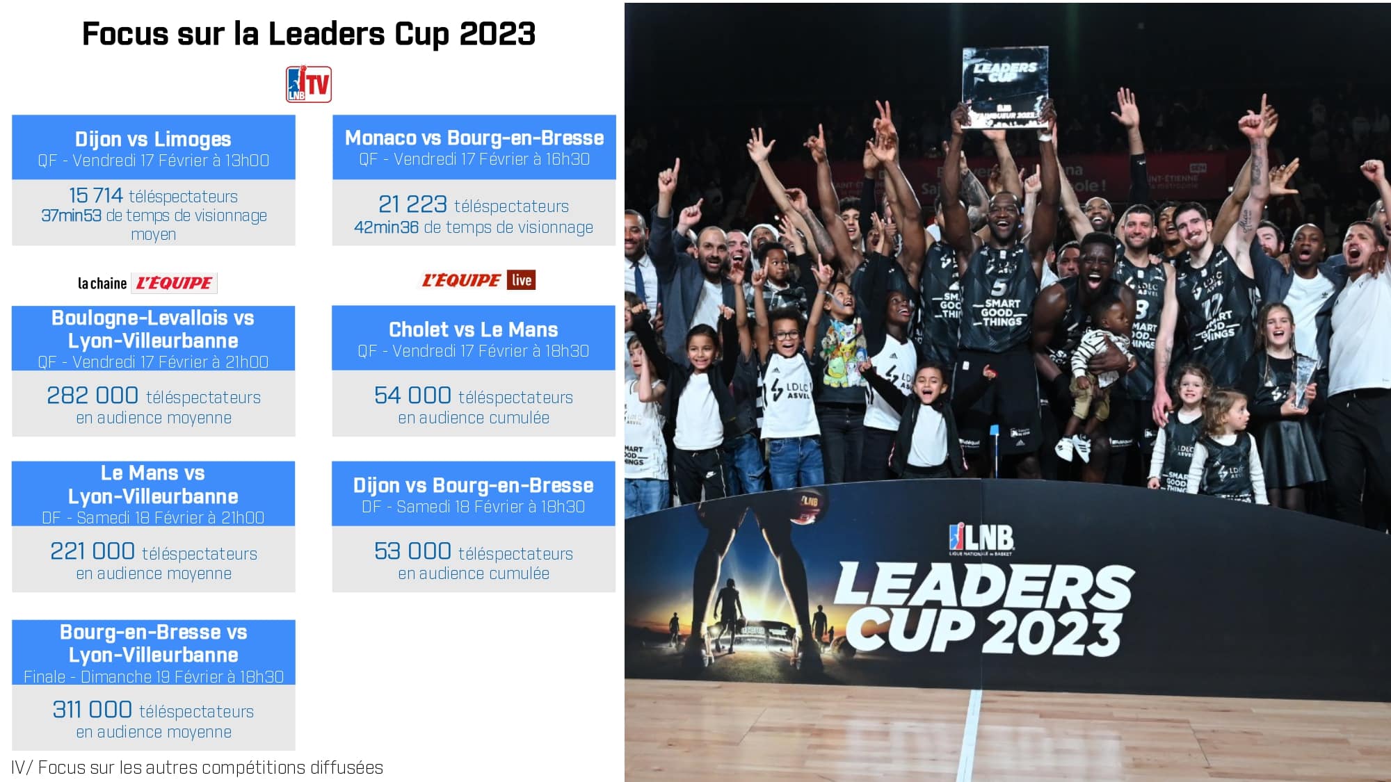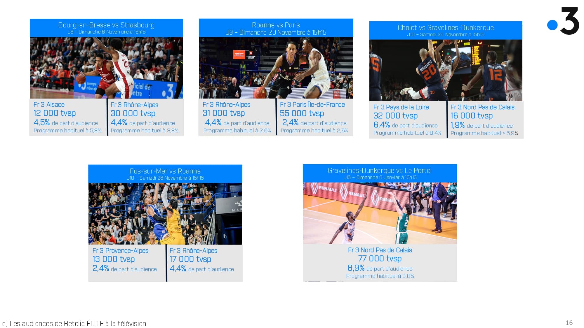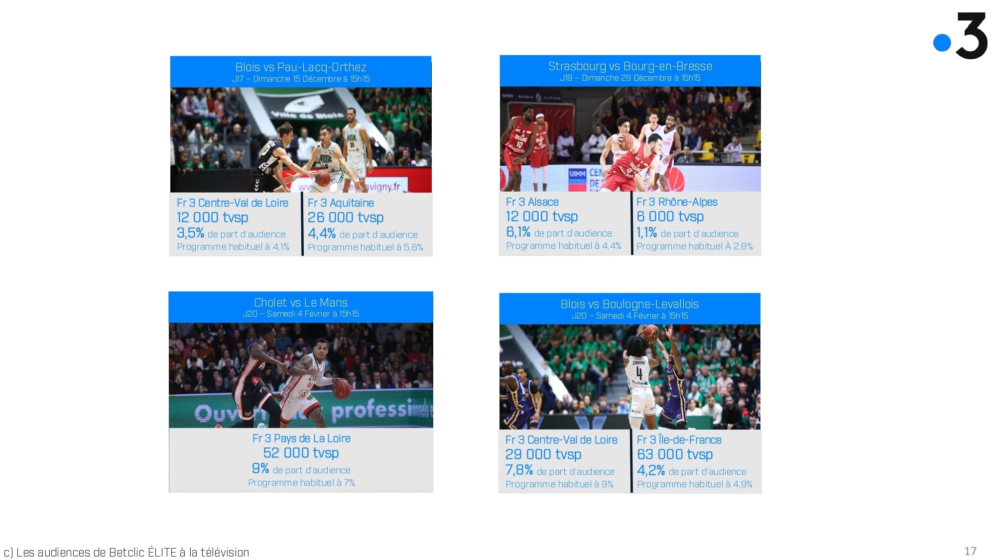 La Ligue Nationale de Basket a publié un document qui compile l'ensemble des audiences sur France 3 lors des décrochages régionaux et sur LNB TV, pour la Betclic Elite et la Pro B, ainsi que sur La Chaîne L'Equipe pour la Leaders Cup.