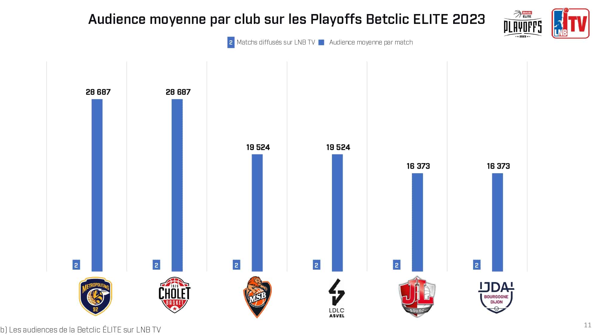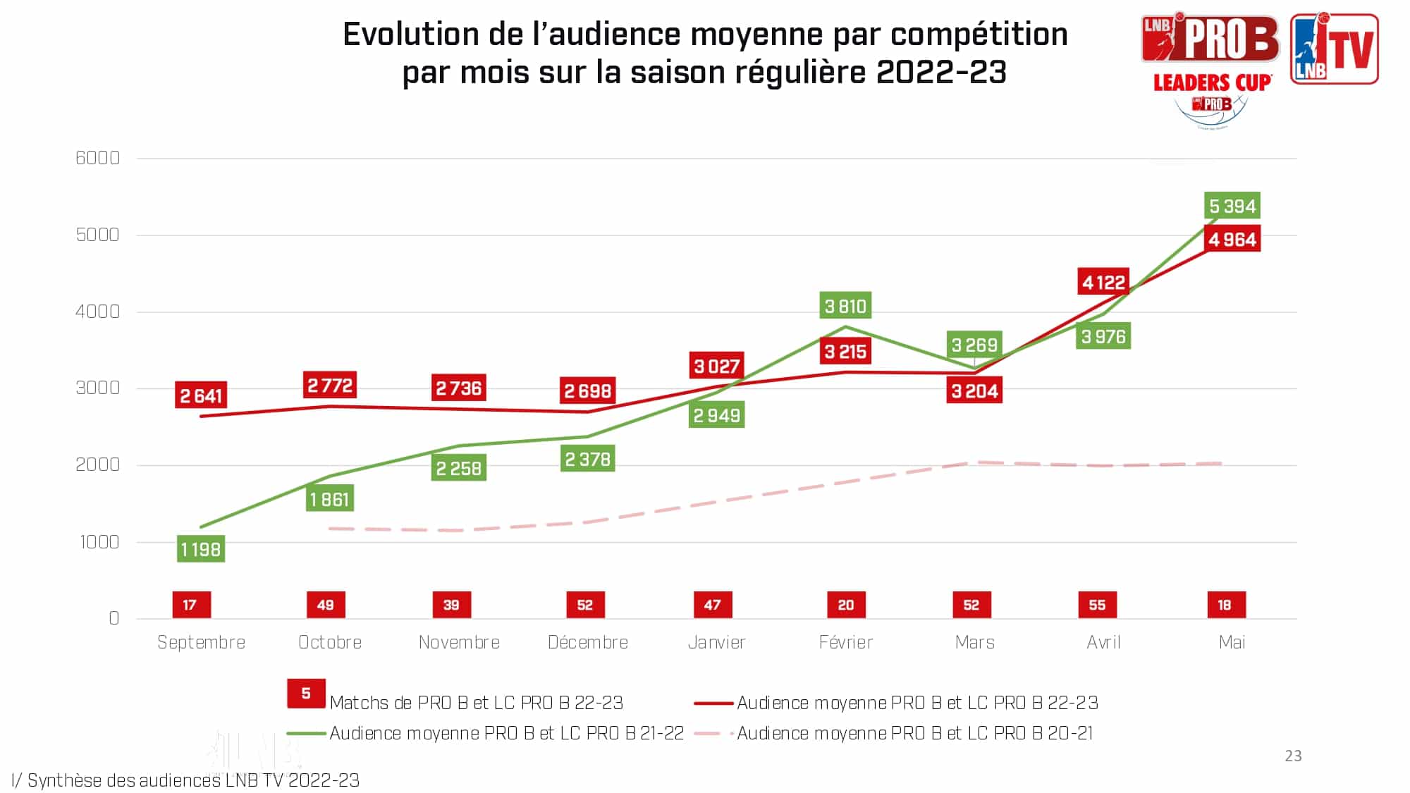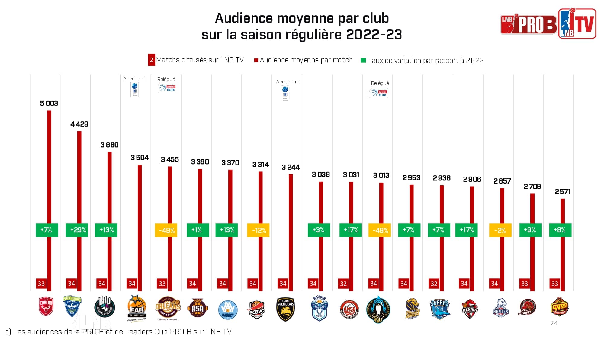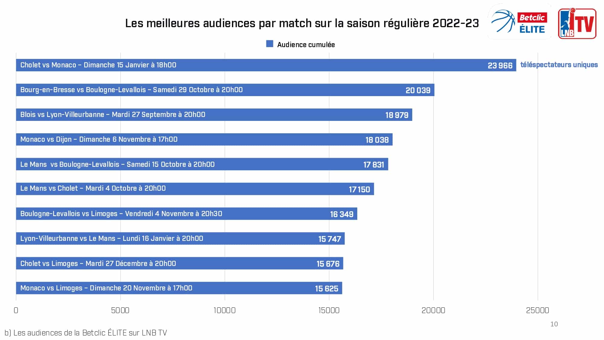 On y découvre que l'audience moyenne sur France 3 a été de 53 940 téléspectateurs, que la finale de la Leaders Cup, ASVEL-Bourg, a atteint 311 000 spectateurs sur L'Equipe TV, que l'audience moyenne des 271 matchs sur LNBTV pour la Betclic Elite a été de 8 882 internautes, que l'effet Wembanyama a permis à Boulogne-Levallois d'être l'équipe la plus suivie, et encore que l'Elan Chalon a régné sur les audiences de Pro B.