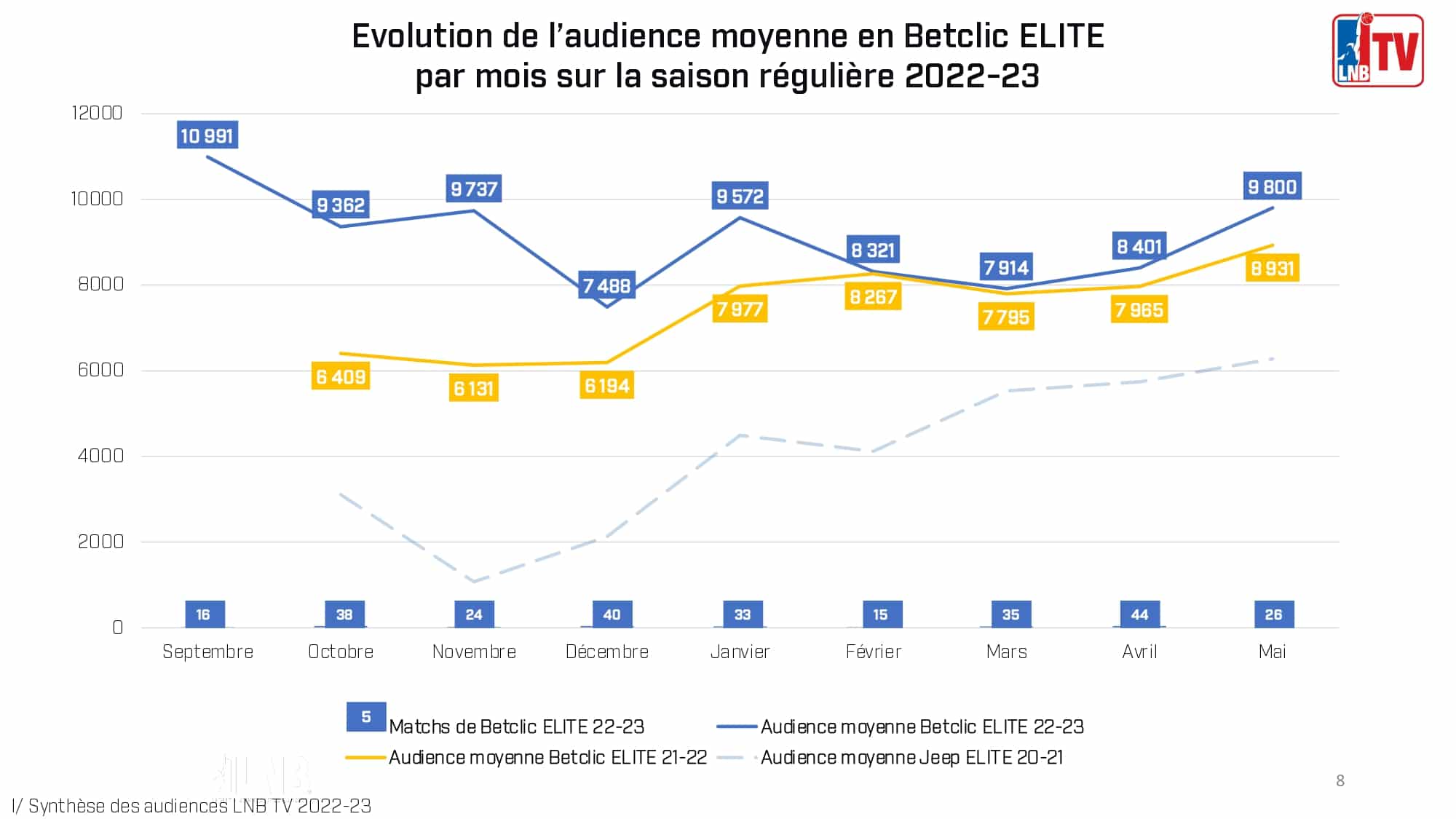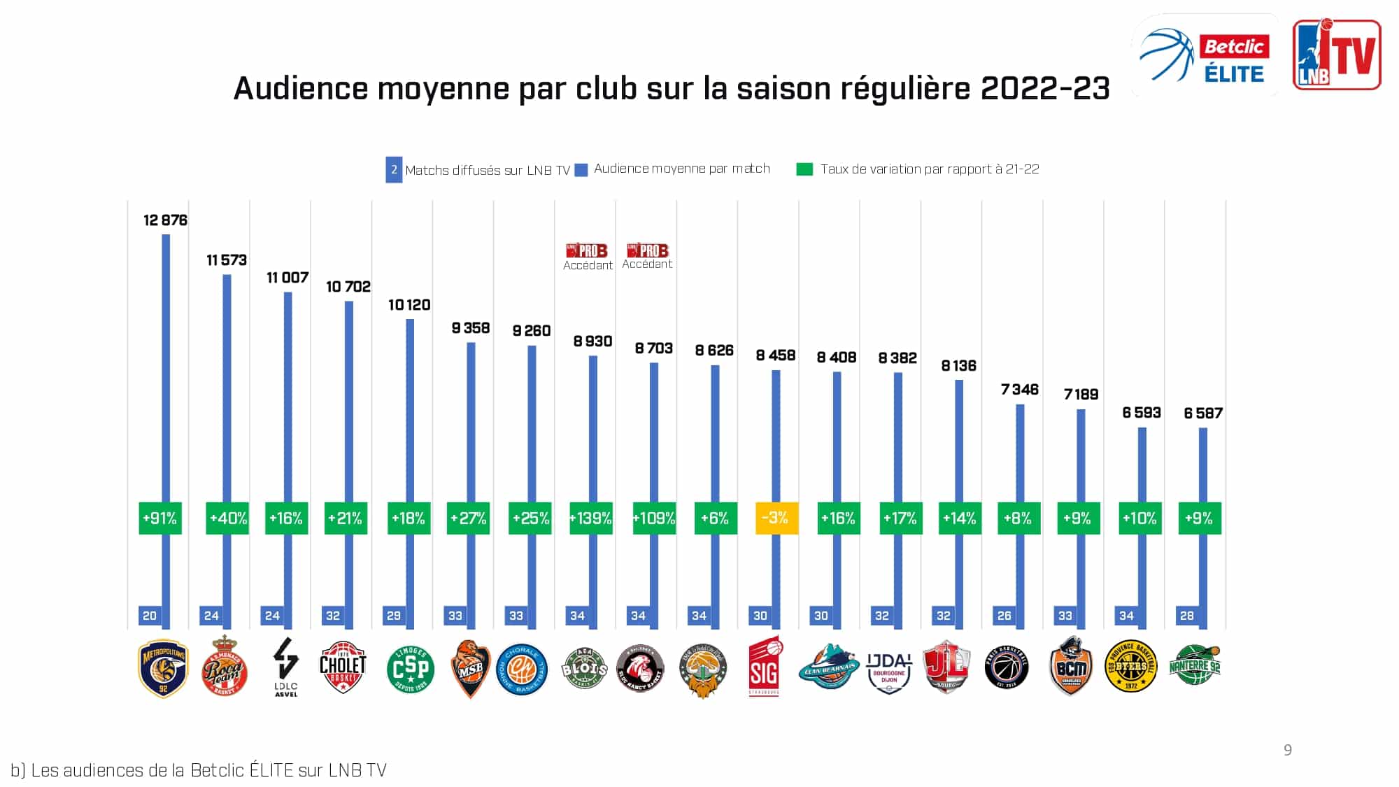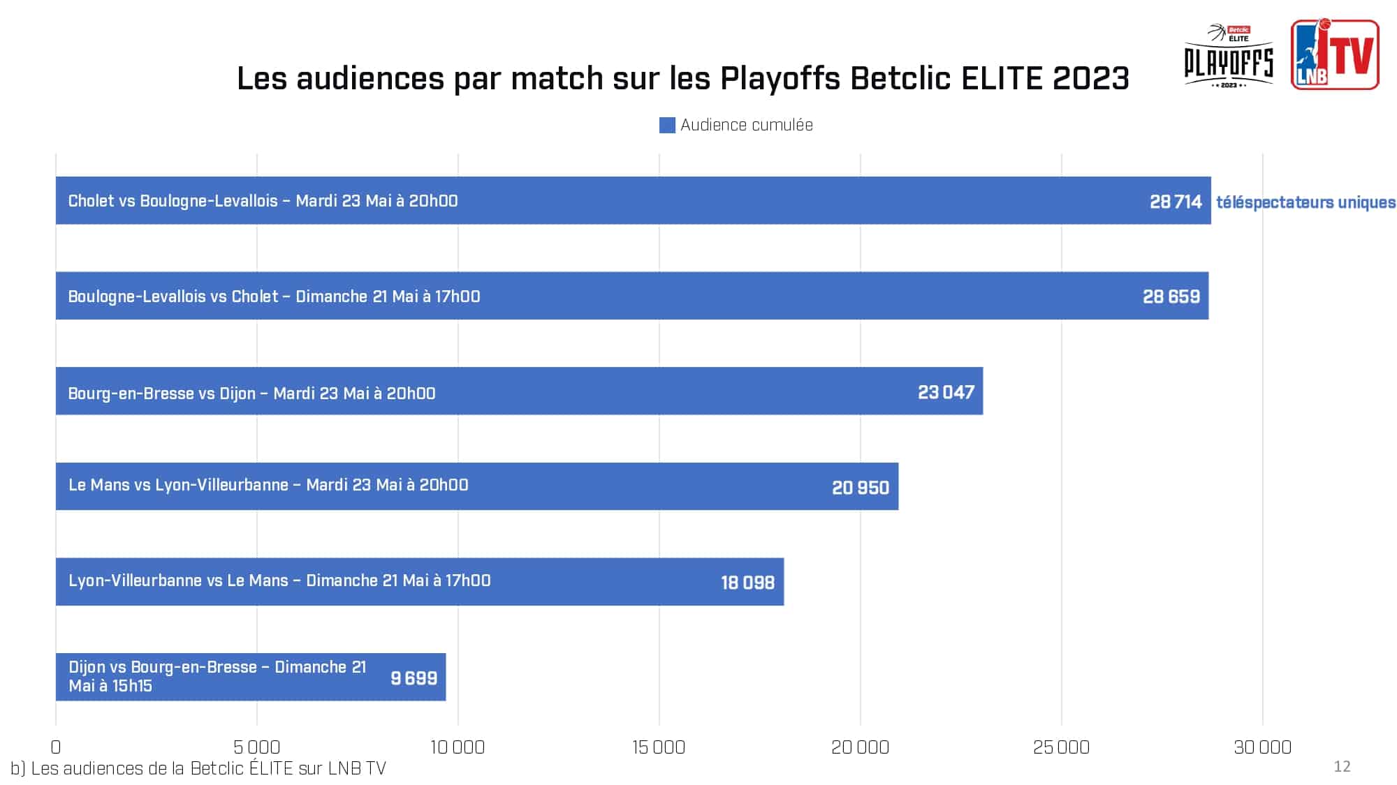 On y découvre que l'audience moyenne sur France 3 a été de 53 940 téléspectateurs, que la finale de la Leaders Cup, ASVEL-Bourg, a atteint 311 000 spectateurs sur L'Equipe TV, que l'audience moyenne des 271 matchs sur LNBTV pour la Betclic Elite a été de 8 882 internautes, que l'effet Wembanyama a permis à Boulogne-Levallois d'être l'équipe la plus suivie, et encore que l'Elan Chalon a régné sur les audiences de Pro B.