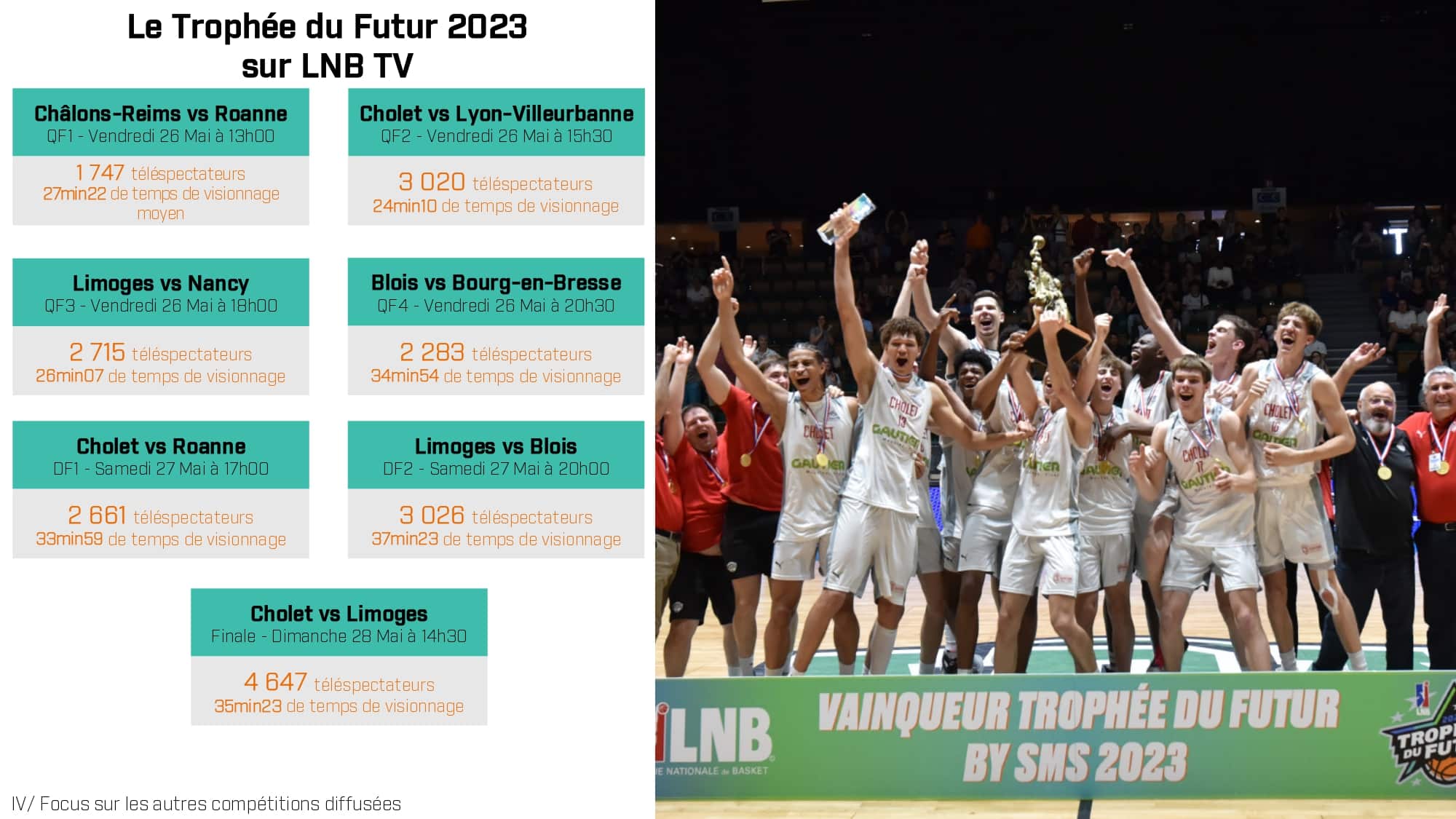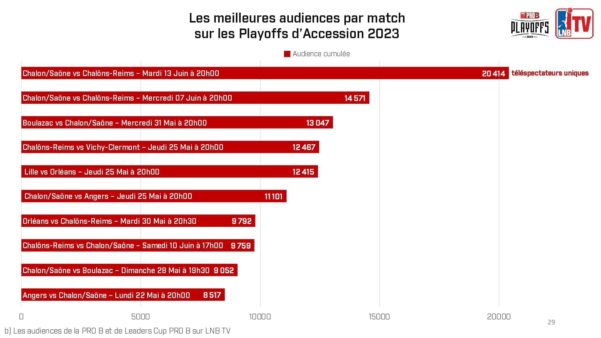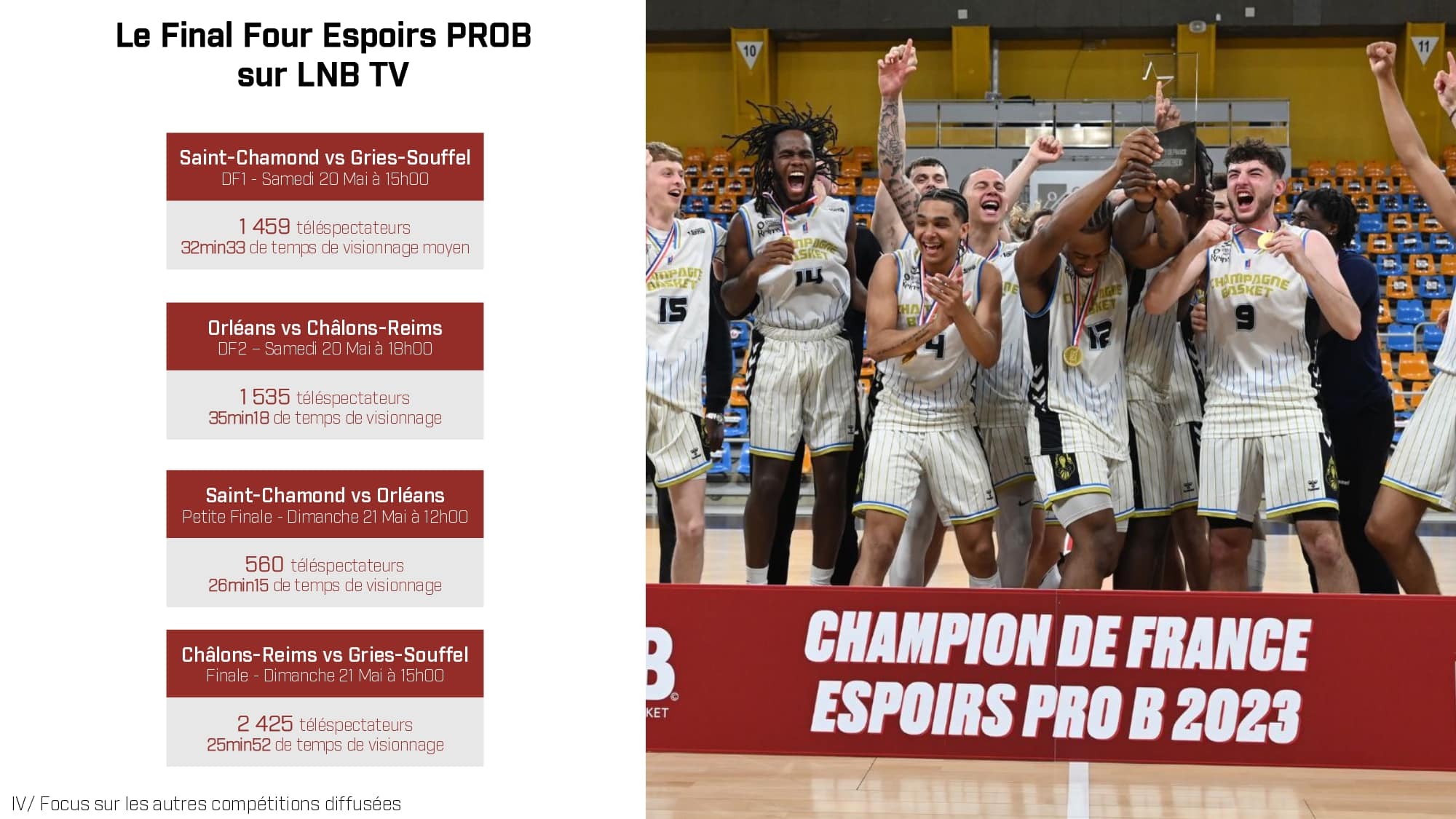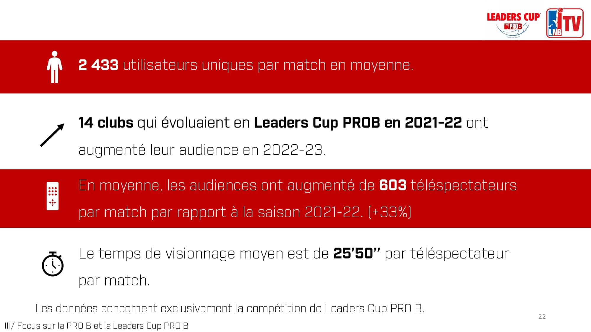 On y découvre que l'audience moyenne sur France 3 a été de 53 940 téléspectateurs, que la finale de la Leaders Cup, ASVEL-Bourg, a atteint 311 000 spectateurs sur L'Equipe TV, que l'audience moyenne des 271 matchs sur LNBTV pour la Betclic Elite a été de 8 882 internautes, que l'effet Wembanyama a permis à Boulogne-Levallois d'être l'équipe la plus suivie, et encore que l'Elan Chalon a régné sur les audiences de Pro B.