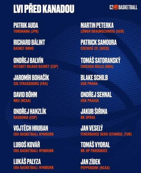 Parmi eux, on trouve l’Américain naturalisé Blake Schilb, 37 ans, Patrik Auda (ex-Boulazac) et aussi Jan Veselý (Fenerbahçe), qui rejoindra l’équipe lors du dernier camp d’entraînement à Prague, ainsi que Tomáš Satoranský (Chicago Bulls) et Jaromír Bohačík (Strasbourg), qui rejoindront l’équipe à… Victoria.