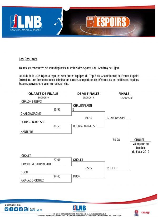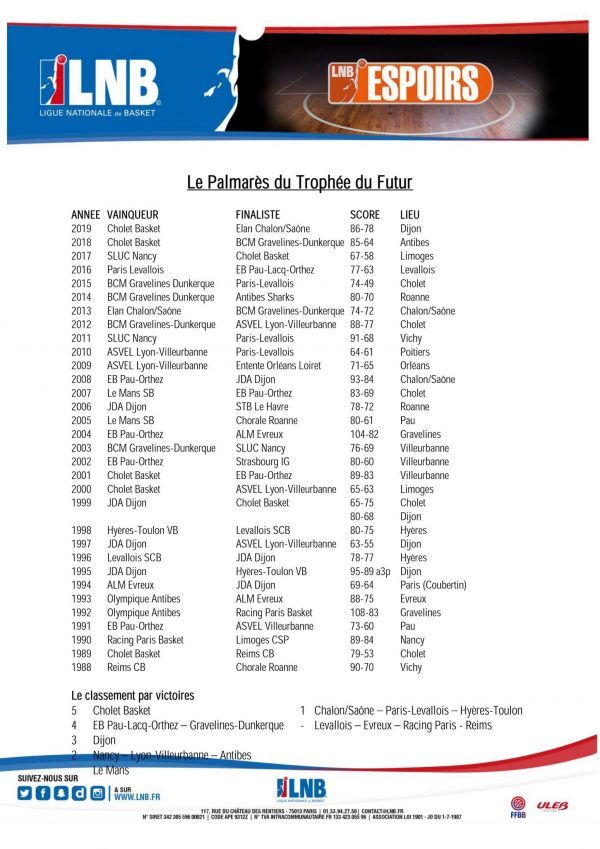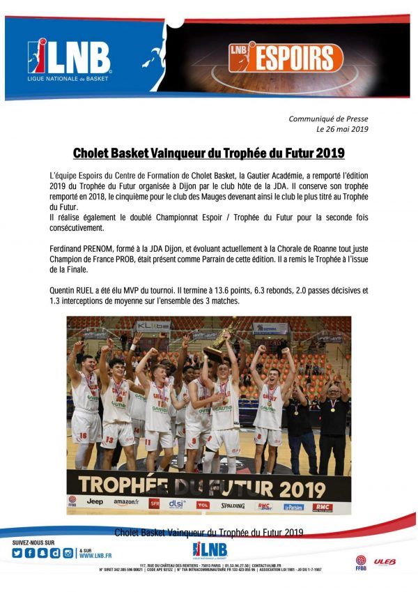 Suite à la victoire de Cholet Basket au Trophée du Futur, la LNB a envoyé un communiqué de presse avec le tableau final et le palmarès de la compétition. Le voici.