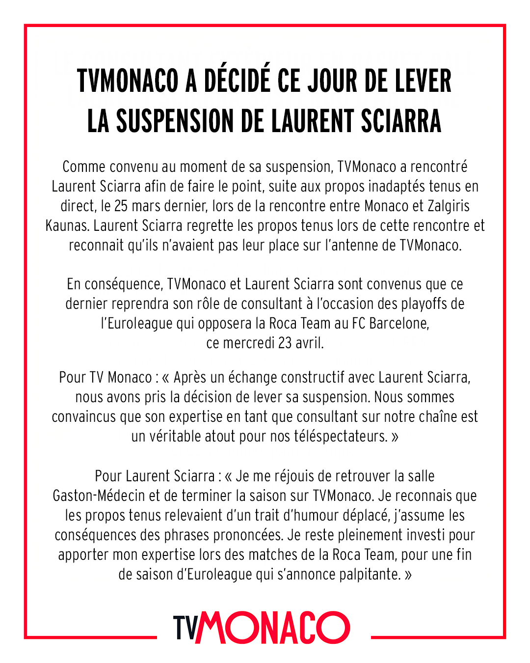 Dans un communiqué, TV Monaco indique que Laurent Sciarra regrette ses propos et qu'il sera de nouveau son consultant pour le match de ce mercredi soir face au FC Barcelone.