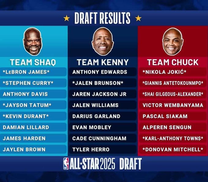 Les anciennes stars de la NBA Shaquille O'Neal, Charles Barkley et Kenny Smith -aujourd'hui commentateurs à la télévision- ont choisi leurs joueurs pour ce All-Star Game 2025 -la quatrième équipe sera celle qui remportera au préalable le Rising Stars Challenge du 14 février; elle prendra le nom de Team Candace, du nom de l'ex internationale et star de la WNBA devenue également commentatrice TV.