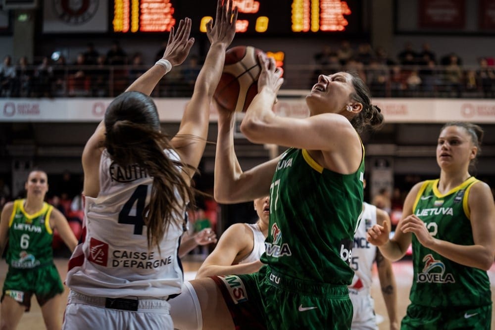 Les Bleues protégeaient bien leur ligne à trois-points mais se faisaient percer à l'intérieur, ce qui permettait aux Baltes de s'offrir un 10/13 à deux-points avant la mi-temps et 18 lancers-francs -14 de transformés- contre seulement 4 aux Françaises. Jean-Aimé Toupane multipliait les changements sans parvenir à trouver la bonne alchimie et, malgré quelques beaux gestes de Marine Johannes (10 points en 15'), la France se faisait rejoindre par ses adversaires galvanisées par les "Lietuva ! Lietuva!" qui descendaient des gradins, et qui trouvaient en Gintare Petronyte et Laura Juskaite des fers de lance offensifs. On en était ainsi à une égalité à 40 à la mi-temps.