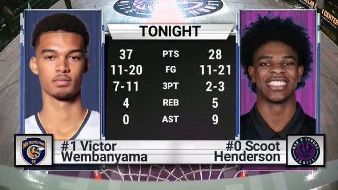 Victor Wembanyama a aligné 37 points dont 7 paniers à trois-points, 4 rebonds et 5 contres et Scoot Henderson 28 points, 9 rebonds et 5 passes.