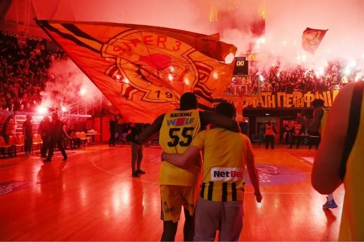 Cela ne peut se passer qu'en Grèce et plus particulièrement à l'Aris Salonique. Pour le 109e anniversaire du club, 109 fumigènes ont été allumés dans le Nick Galis Hall après la victoire sur Ionikos. Les supporters et les joueurs ont chanté et dansé. Impressionnant.