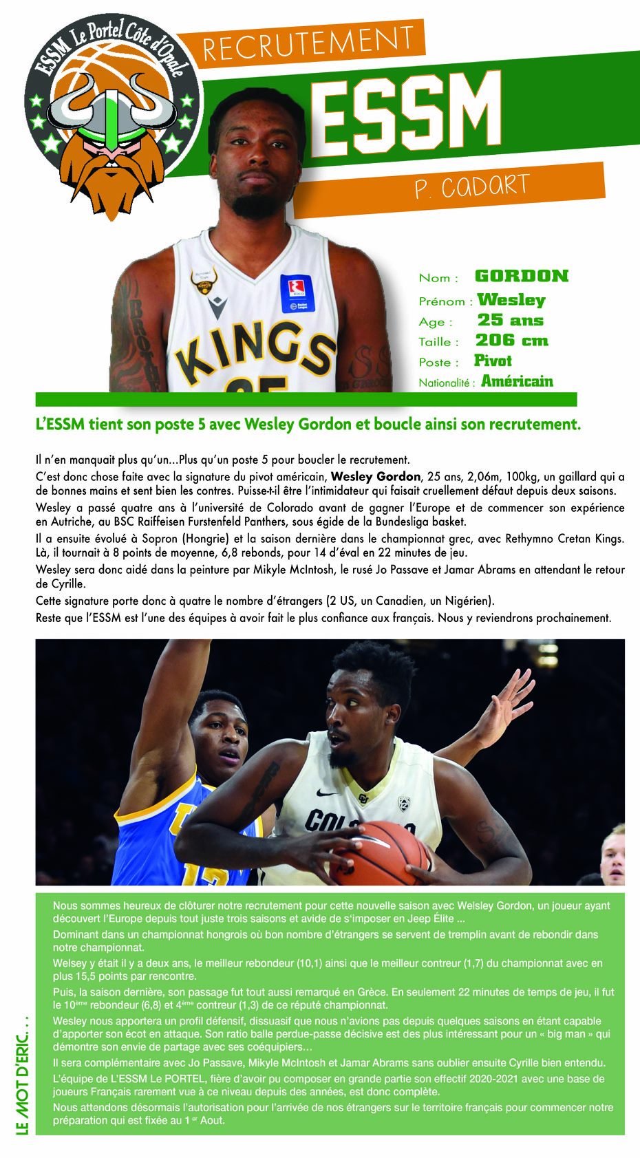 L’ESSM Le Portel affiche complet avec le recrutement du pivot américain Wesley Gordon (2,06m, 25 ans).