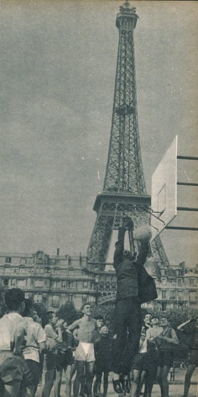 Découverte par Daniel Champsaur, responsable du patrimoine à la fédération française, cette photo en noir et blanc de Wilt Chamberlain, sortie de nulle part, fait écarquiller les yeux. L’échassier, comme on le surnommait, dunke en costard et chaussures de ville devant une ribambelle de marmots avec en toile de fond la Tour Eiffel.
